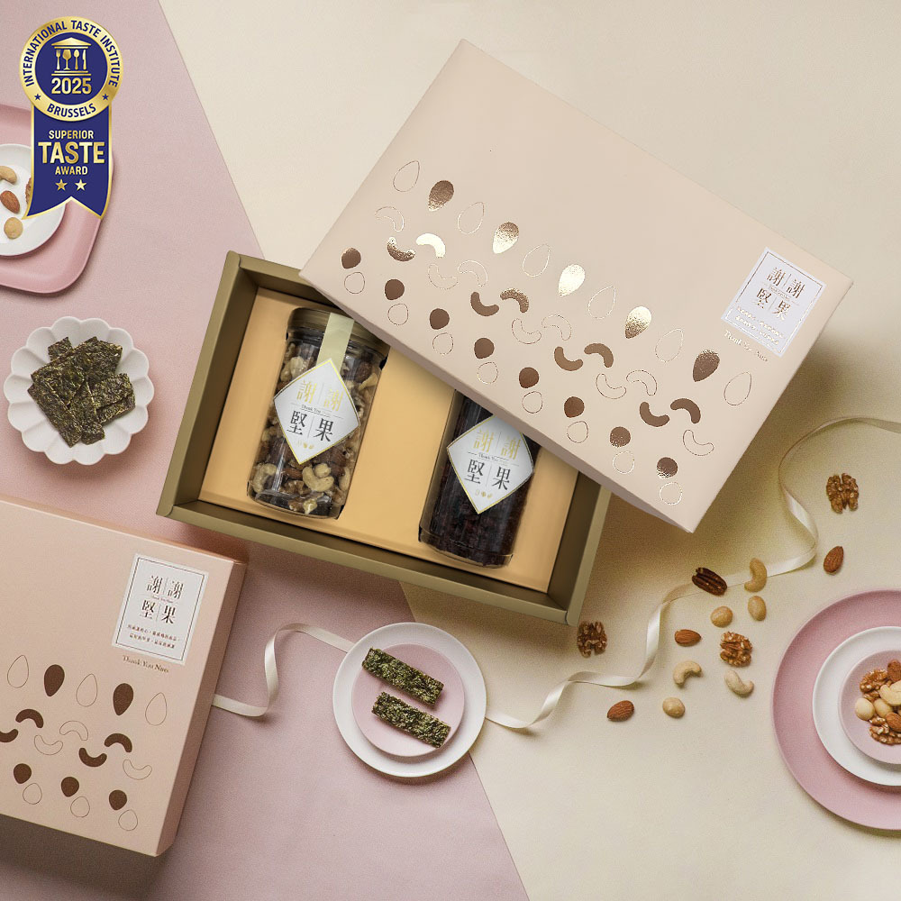 謝謝堅果獲得 2025 ITI 風味絕佳二星獎(International Taste Institute),在國際感官品評中獲得肯定。當你把禮盒遞給媽媽時,可以說:「這家台灣品牌拿到了國際食品評鑑的二星認證」——這個細節,比單純說「我覺得好吃」更有說服力。