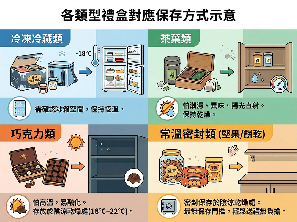 冷凍類需冰箱空間、茶葉怕潮濕、巧克力怕高溫。常溫密封保存的堅果或餅乾禮盒是最沒有保存門檻的選擇。