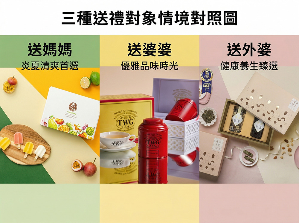 A:建議優先考慮品牌知名度高、口味保守、包裝體面的選擇。百年品牌郭元益、高端精品 TWG Tea、獲得國際認證的謝謝堅果,都是送婆婆說得出口的選項。