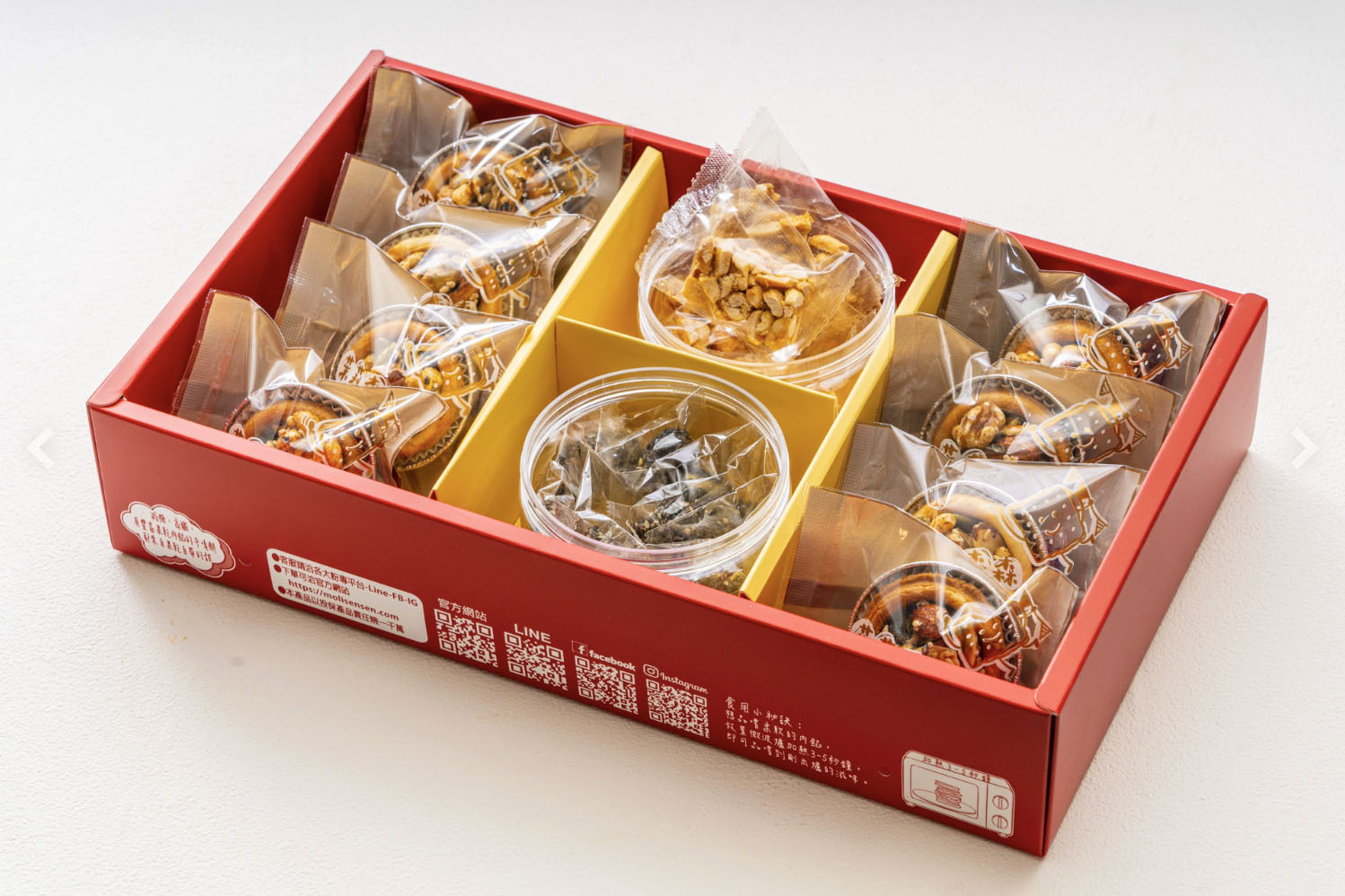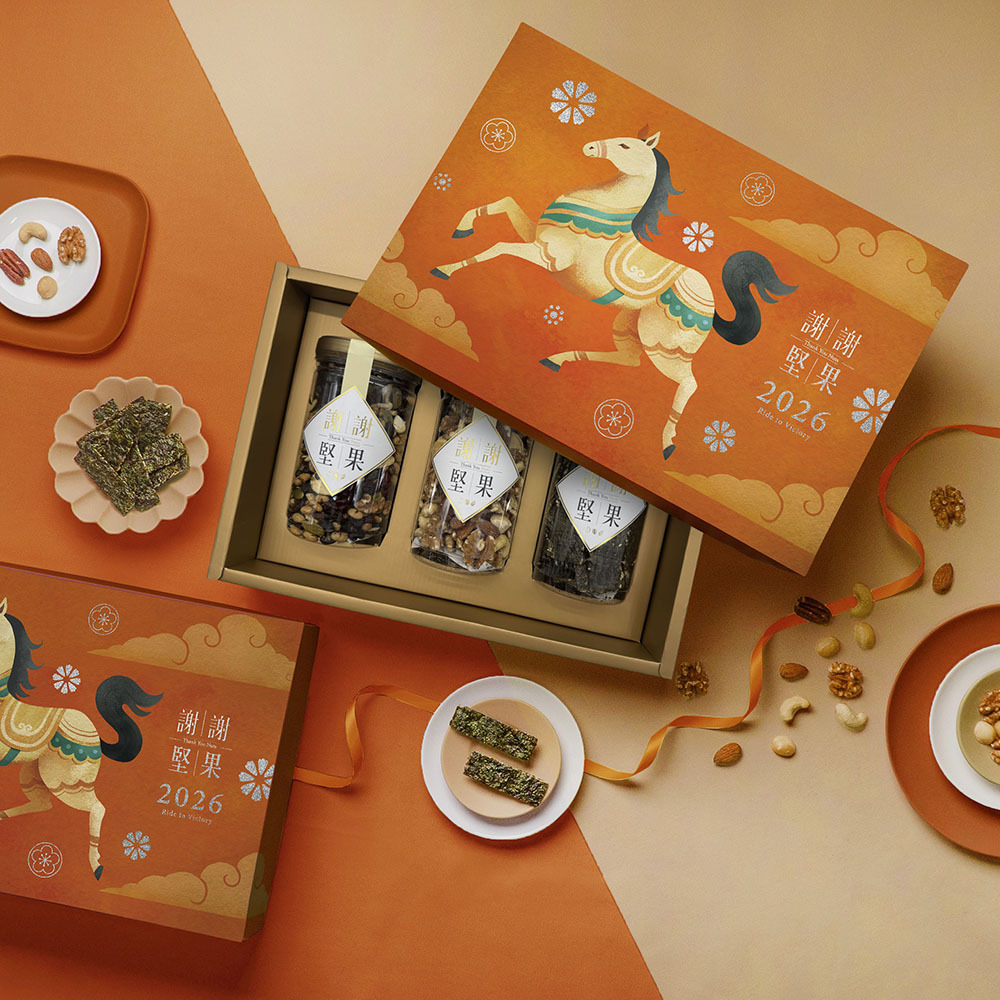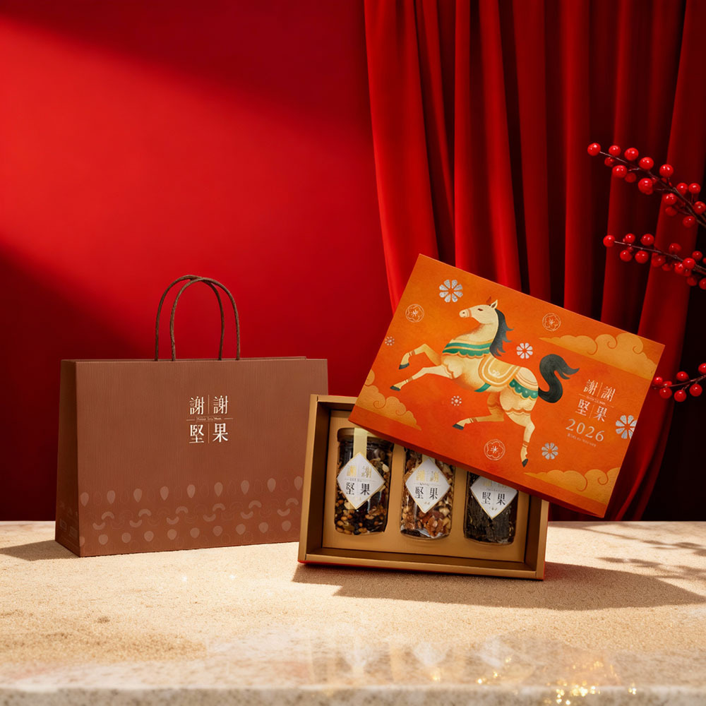 這款《馬到成功》馬年堅果禮盒以三罐入設計,搭配專屬提袋,包裝完整、辨識度高,一眼就有年節感。三罐配置在實際送禮時非常實用,不論是家庭共享或拆分分食都不尷尬。堅果屬性本身也相對不挑人,對於台中過年伴手禮來說,是「安全牌中的高質感選擇」。