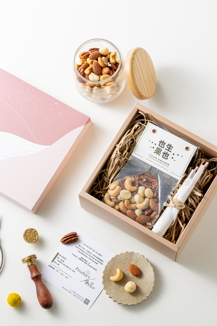 也生也果位於台中南屯區,主打低溫烘焙精品堅果,禮盒設計簡約有質感,適合不想走傳統紅色系路線的過年伴手禮。