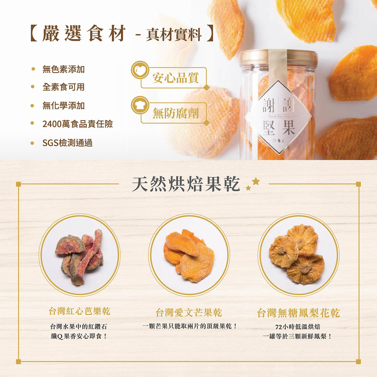 特選陽光土地孕育出的台灣金鑽關廟鳳梨,全程不加糖低溫慢烘,成就等待72小時才能醞釀的極致美味;無著色、無漂白、無防腐劑、更通過SGS安心認證,每一口,都稱得上是台灣驕傲!
